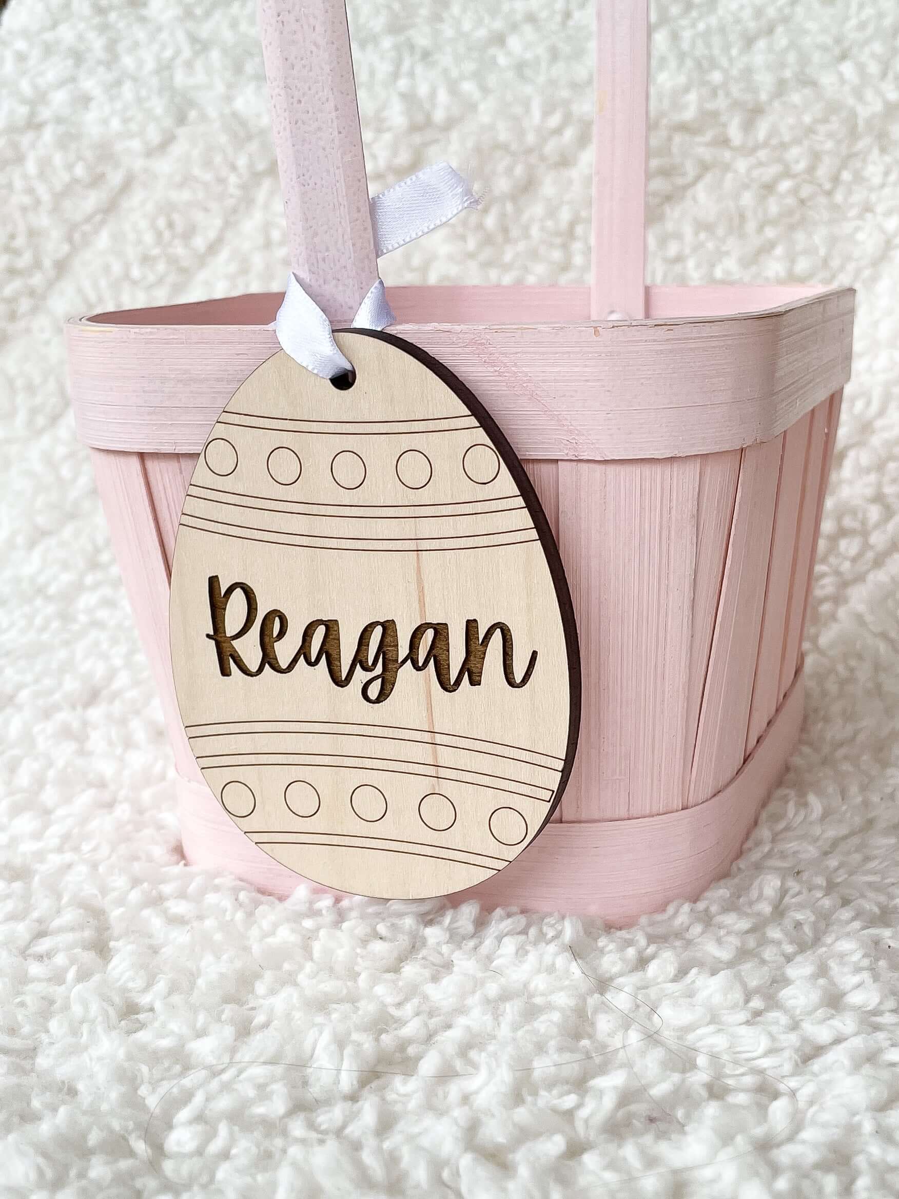 This personalized, engraved egg shaped name tag will be a sweet addition to your child's Easter basket and can be used year after year. Each tag is engraved to order, hand sanded, and accompanied with white ribbon to tie on your basket. Choose from four different font options to customize for your preferred style.